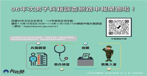 3.可利用手機、平板、電腦等裝置上網申報,該年次即將畢業之男子如無升學意願者,儘早申報可儘快安排徵兵檢查及徵集入營。
