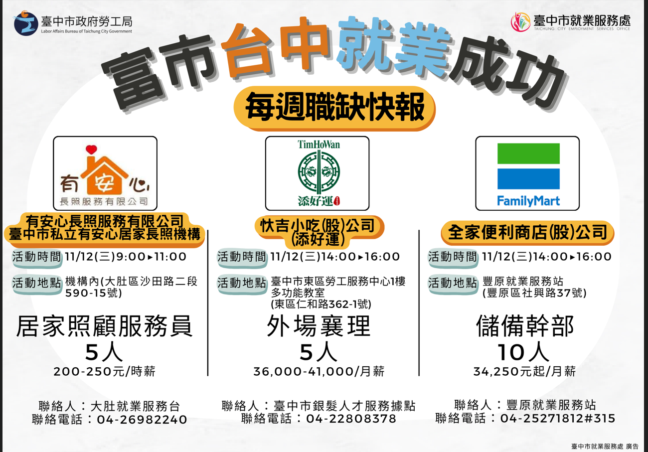 1108-1 「臺中市政府職缺快 報來囉!11/11-11/14邀請有安心長照、添好運、全家等廠商,辦理10場徵才,提供303個職缺,查詢更多職缺資訊:https://gov.tw/XJo,請洽04-22289111轉36100洽詢。」