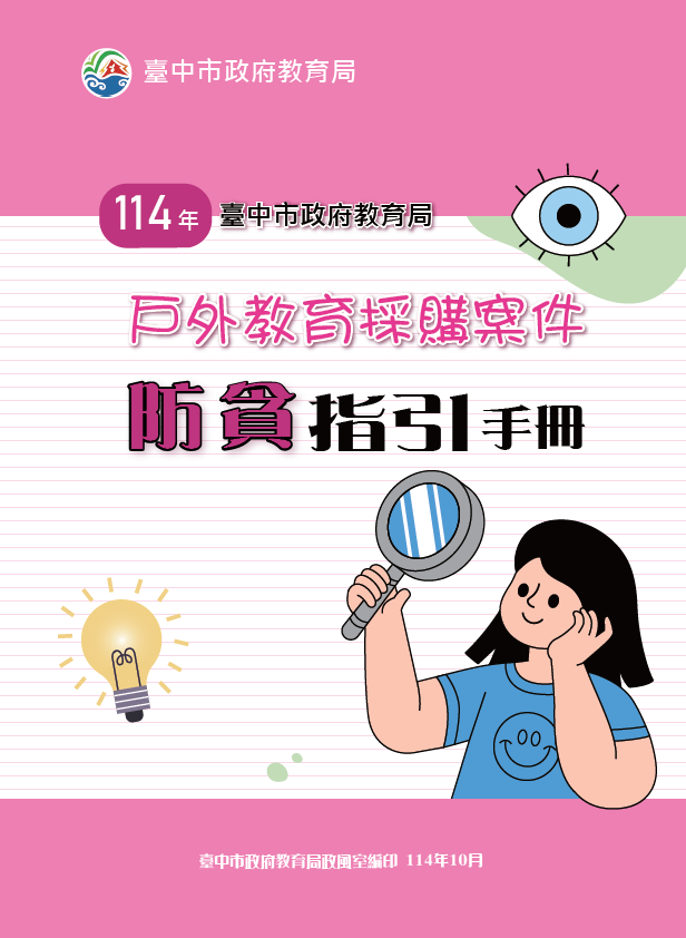 爰此,本局特编印《户外教育採購防貪指引》,收錄多起經司法認定或實務調查之典型案例,經去識別化處理後,依事件性質,分析可能的風險態樣,並研擬可行的防治措施。内容涵蓋從招標文件保密、評選過程公平、公帑核銷正確,到驗收程序落實等多個面向,期望藉由案例的警示作用,使承辦人員理解法律規範背後的制度意旨,並在日常業務中主動落實廉政觀念。
