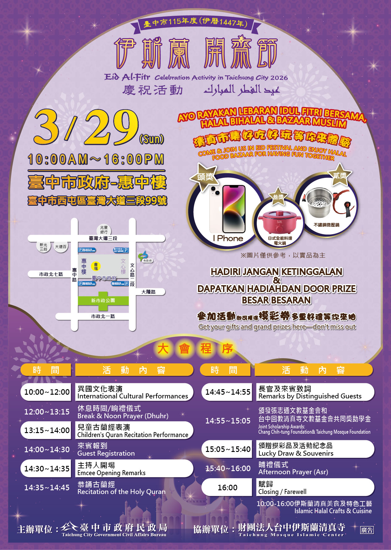 臺中市政府民政局訂於115年3月29日(星期日)上午10時至下午4時,在本府惠中樓1樓及中央挑高穿堂(臺中市西屯區臺灣大道三段99號)舉辦「臺中市115年度伊斯蘭開齋節慶祝活動」